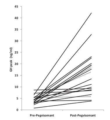 Figure 1. Individual changes of GH-peak before and after pegvisomant challenge. Dotted lines represent pubertal patients.