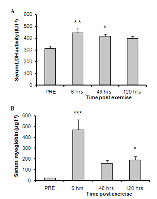 Figure 1. Changes in serum (A) lactate dehydrogenase (LDH) activity and (B) myoglobin (Mb) concentration over time compared with the pre-exercise (PRE) levels (mean ± S.E.M.; n=9). Significantly different from pre-exercise; *: p <0.05, **: p <0.01, ***: p <0.001.