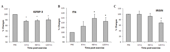 Figure 2. Percent changes of serum (A) insulin-like growth factor binding protein-3 (IGFBP-3), (B) free thyroxine (fT4), and (C) irisin over time in relation to their pre-exercise (PRE) levels (mean ± S.E.M.; n=9). Significantly different from pre-exercise; *: p <0.05.