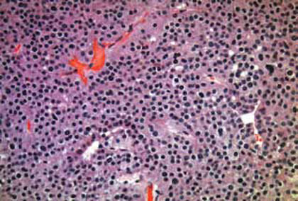 Ultrastructurally, the tumor consisted of medium-size, closely apposed, polyhedral cells (Figure 3). Their largely achromatic, ovoid nuclei possessed moderate to sizable nucleoli. The lucent cytoplasm contained slender parallel stacks of moderately developed rough endoplasmic reticulum and Golgi complexes. Randomly scattered, secretory granules varied in number and focally were numerous. In the majority of cells, they were small (100-150 nm), but scattered cells contained large (up to 300 nm) spherical, irregular, and drop-shaped granules. Mitochondria were normal in number and appearance. Many cells contained lysosomes.