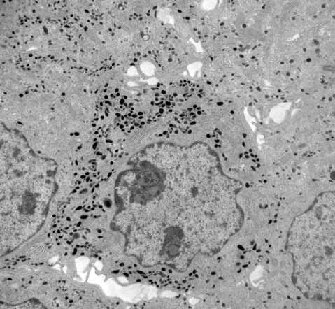 Figure 3. EM: Ultrastructurally, the tumor consists of middle size, polyhedral cells with euchromatic nucleus with moderate to sizable nucleoli. The cytoplasm contains moderately developed rough endoplasmic reticulum and Golgi complexes. Note the numerous small drop-shaped secretory granules characteristic of the tumor-type. (Original magnification x 10000).
